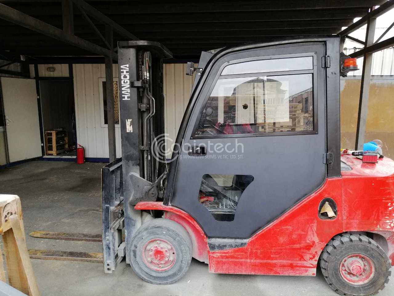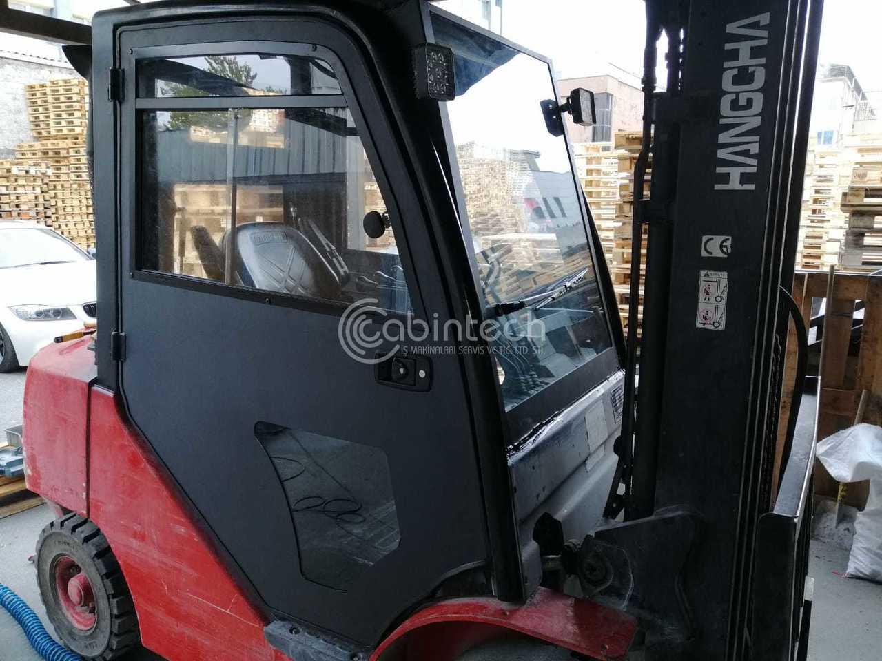 Hangcha forklift kabini operatörün aracı kullanımını ve bakımını, tamirini engellemeyecek şekilde monte edilir. Kabinin tepesinde yük asansörünü denetlemek için küçük bir pencere bulunur. Forklift kabinleri operatörün dış etkenlerden korunmasına yardımcı olmak için üretilir. Ayrıca geniş cam dizaynı ile geniş görüş açısı sağlanmaktadır. Kabin operatörün rahat hareket edebilmesi için özenle dizayn edilebilmektedir. Kabinde girip çıkılabilmesi için bir adet kapı bulunmaktadır. Bu kapı isteğe bağlı olarak parçalı bir şekilde montajlanabilir.